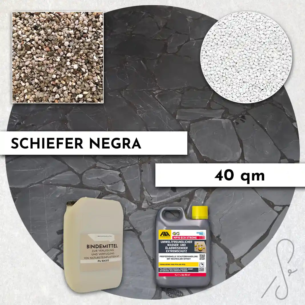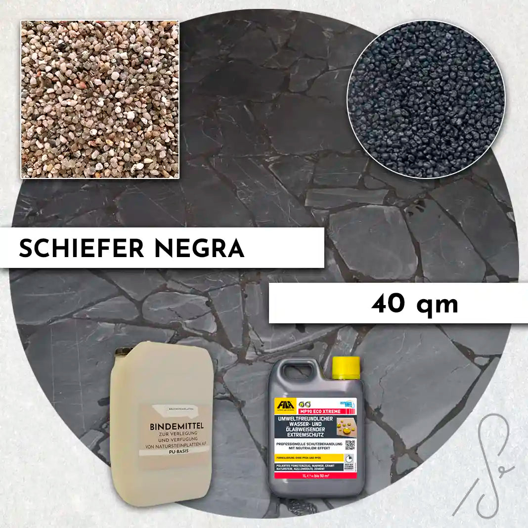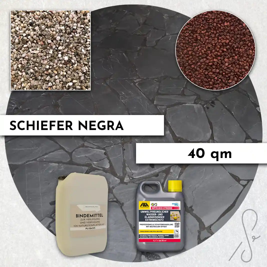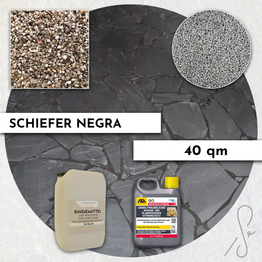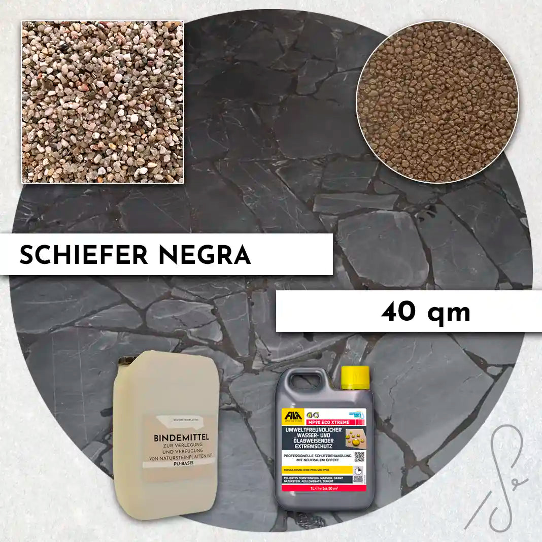 Komplettpaket COMPRESA für eine 40 m² Terrasse mit Negra Schiefer Polygonalplatten und einem Unterbau von 3 cm