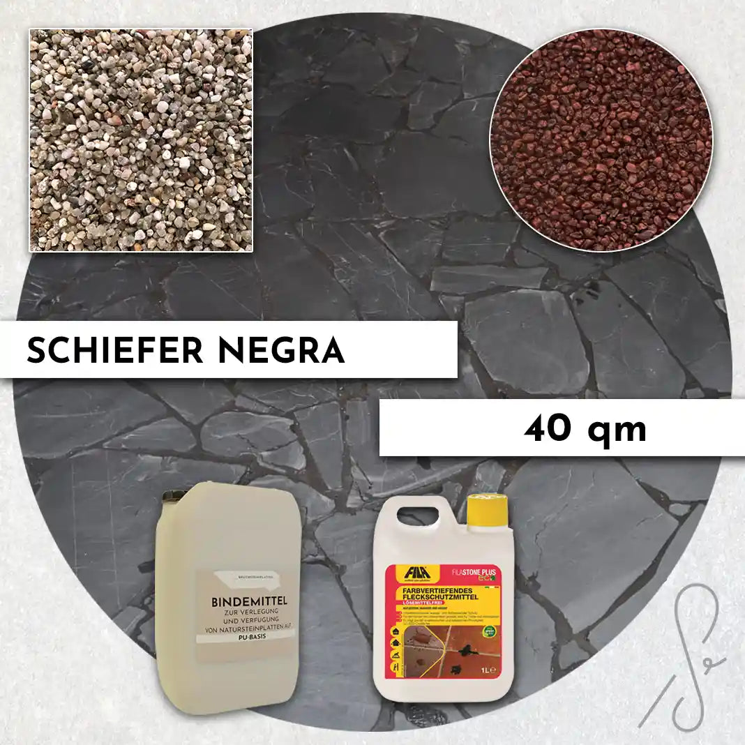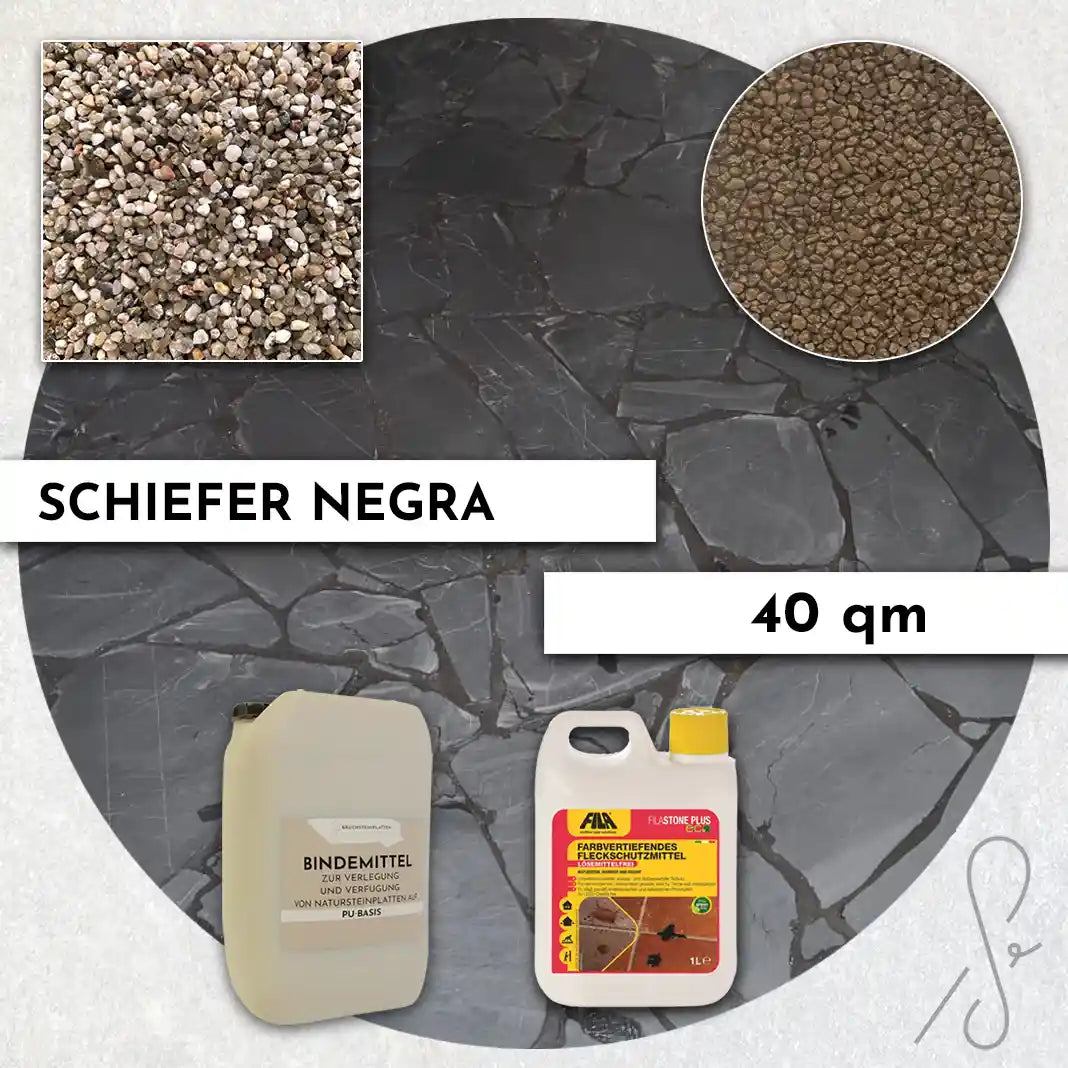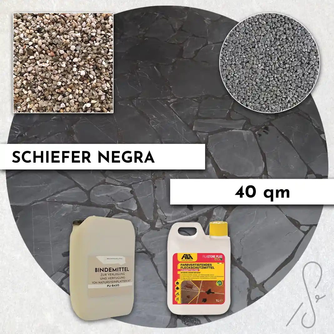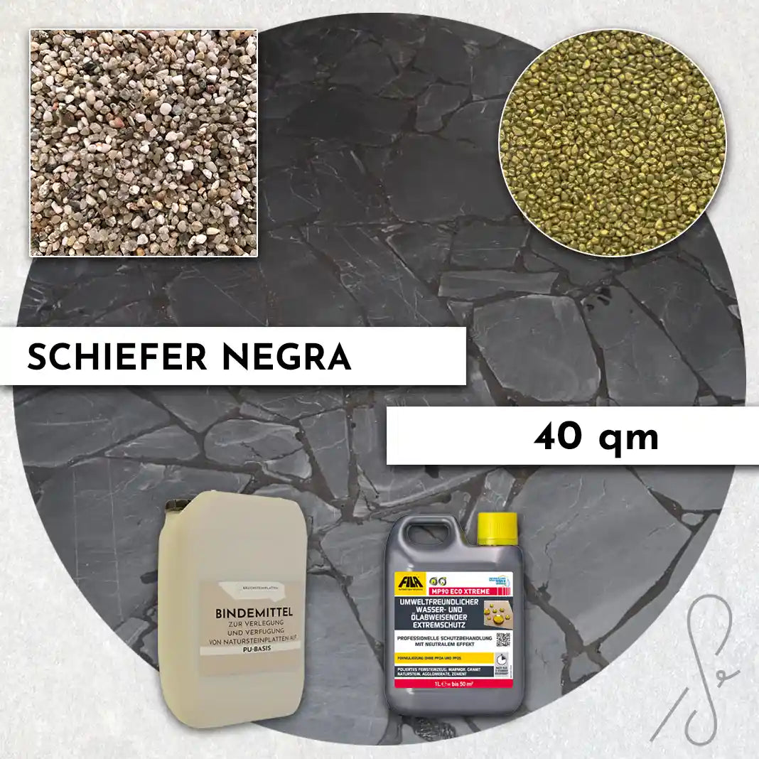 Komplettpaket COMPRESA für eine 40 m² Terrasse mit Negra Schiefer Polygonalplatten und einem Unterbau von 3 cm