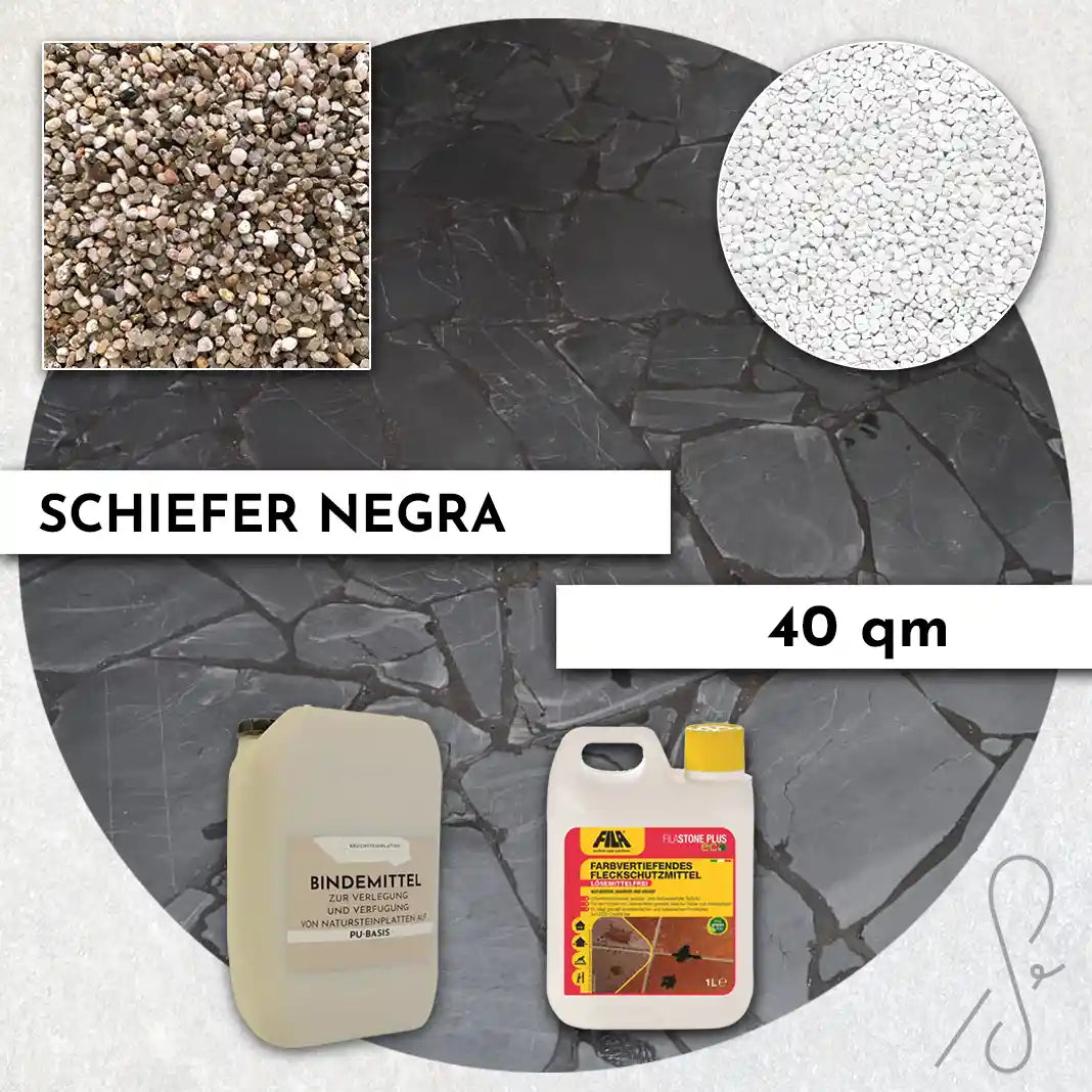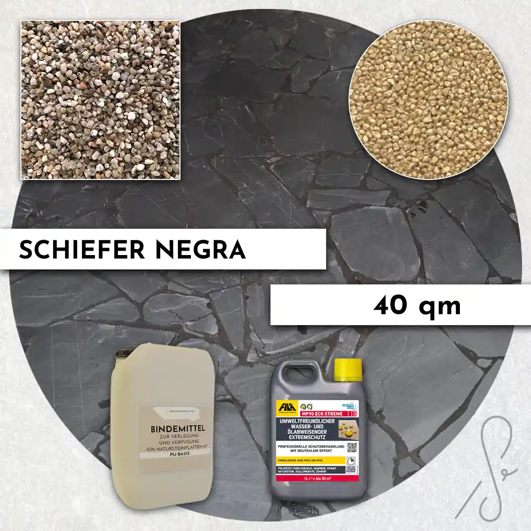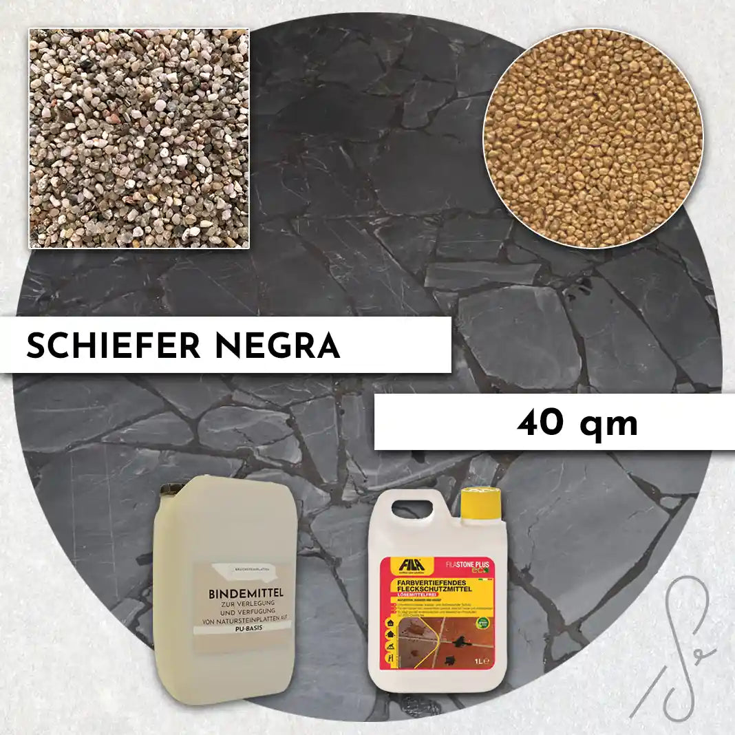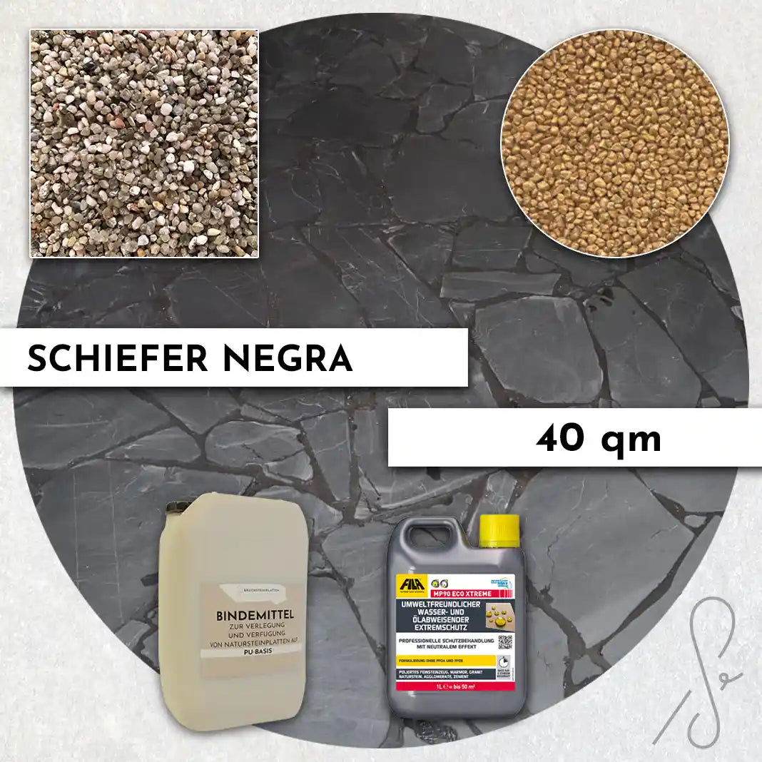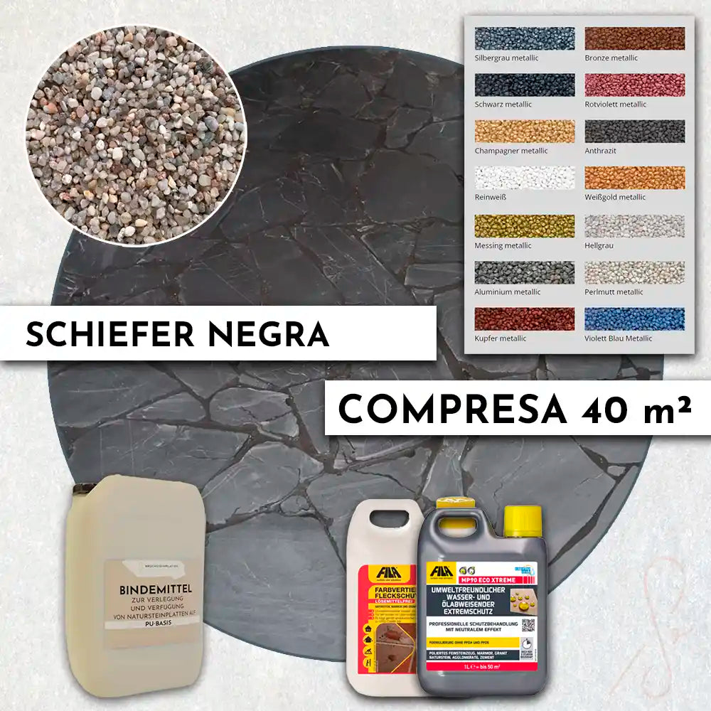 Komplettpaket COMPRESA für eine 40 m² Terrasse mit Negra Schiefer Polygonalplatten und einem Unterbau von 3 cm
