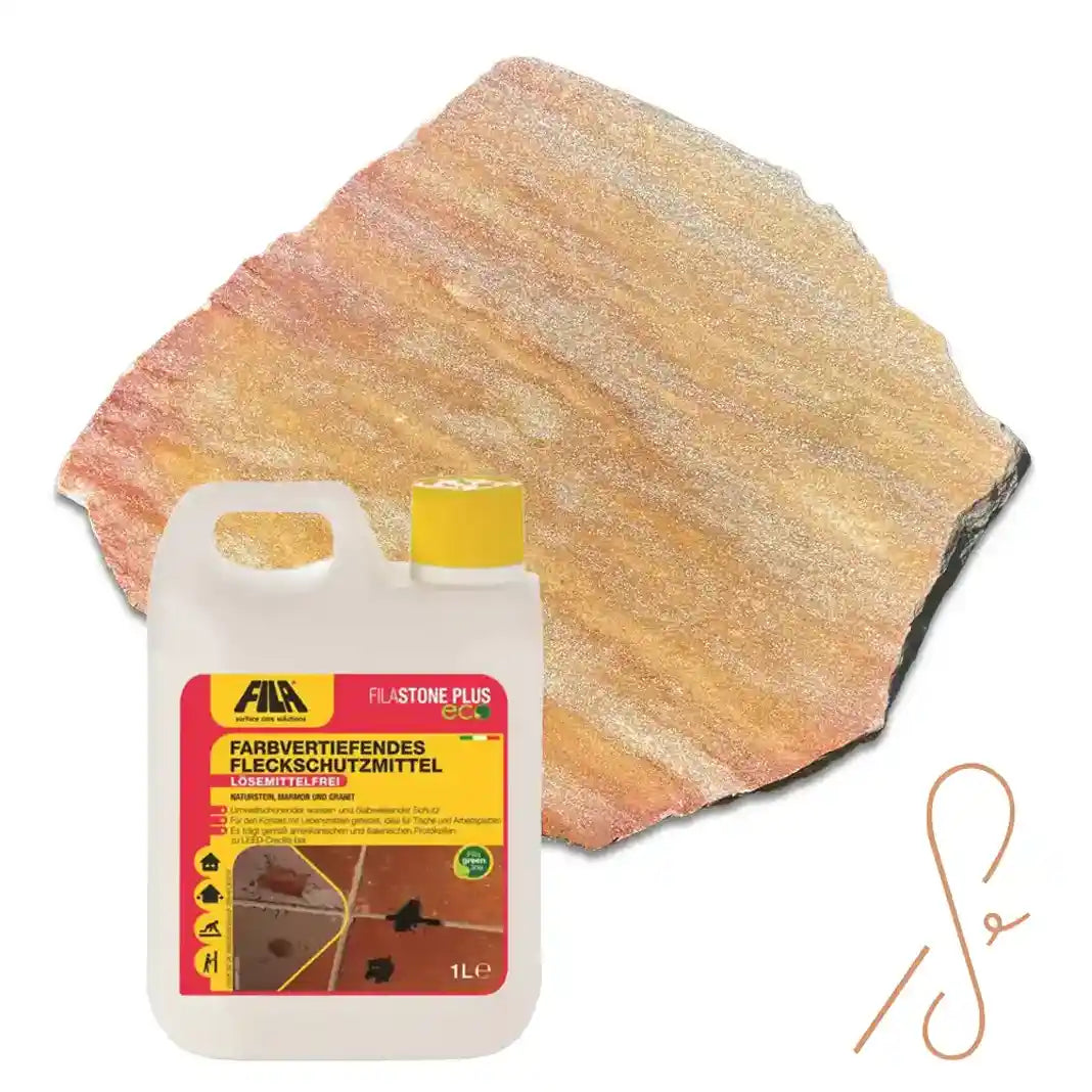 Abgestimmte Produktkombination (Bundle) aus Quarzit Bruchsteinplatten Antares und der dazu passenden Menge an Imprägnierung.